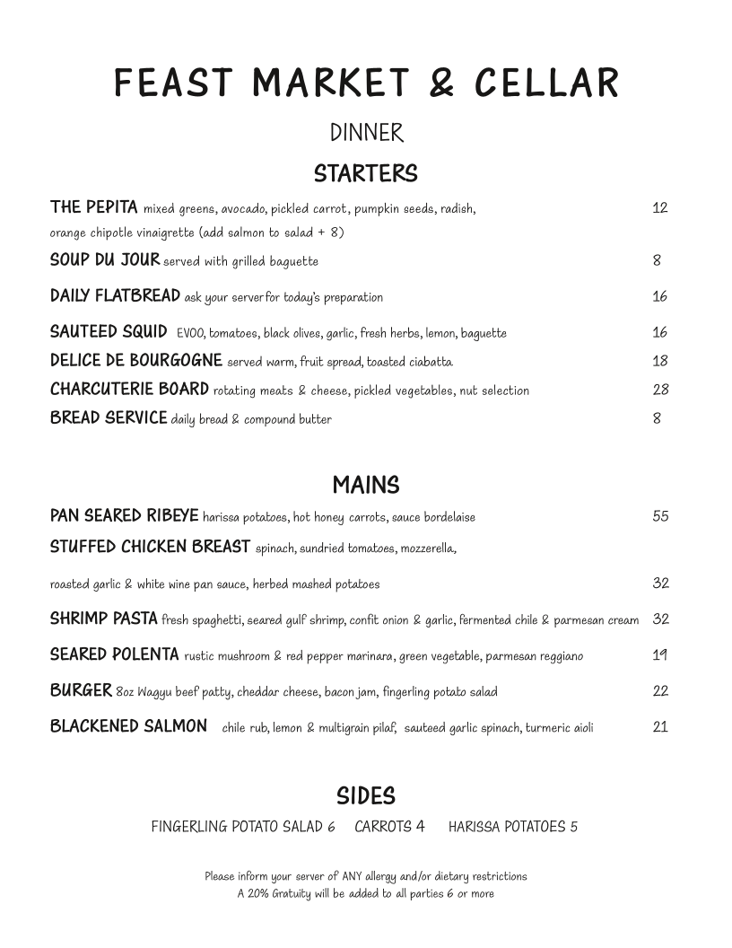 Welcome to Feast Market & Cellar, a culinary gem nestled in Bloomington! This intimate venue offers an inviting atmosphere paired with a thoughtfully curated menu. Start your evening with the vibrant The Pepita salad or the rich Sautéed Squid. For those uncertain, the Daily Flatbread takes a spotlight, varying each day to showcase seasonal ingredients.